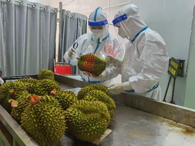 10月7日,广西荣盛国际物流有限公司代理申报的越南榴莲,通过友谊关口岸鲜活农产品“绿色通道”进入海关监管区,经海关严格检疫查验合格后,快速放行进入国内市场。