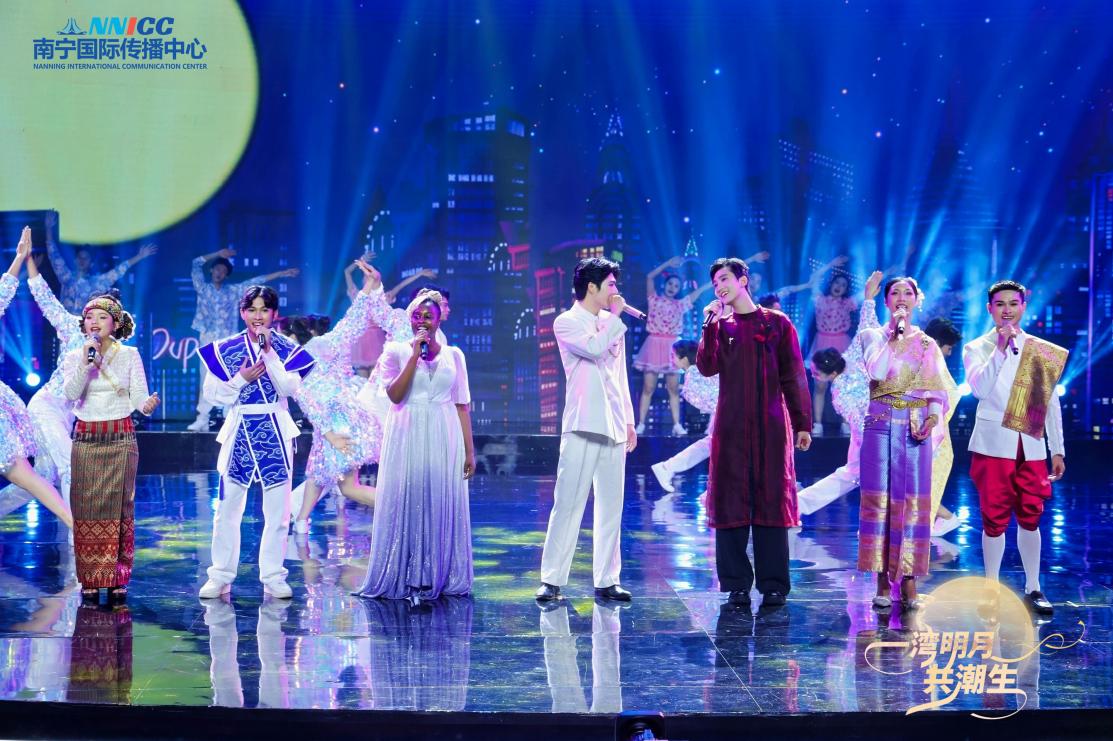 开场舞《月邀宾朋》由中国演员与16名东盟多国留学生联袂呈现,他们身着各国民族盛装,从观众席与舞台翩然汇聚,以“老友情怀”传递“心手相连”的深厚情谊;中国与东盟十国舞者携手演绎《明月共山海》,以风格鲜明的民族舞蹈,诠释“山海相连,明月同心”的和谐图景;中越歌手深情对唱《你来我往有情缘》,借“山相依、水相连”的动人旋律,献礼两国建交75周年,唱出源远流长的友好情谊;跨国合唱《月亮代表我的心》唤醒了中外观众的共同情感记忆;在AI数智人“月光行者”的虚实呼应、与AR技术构建的沉浸场景烘托下,全体演员与观众齐声合唱晚会主题曲《明月共潮生》,将气氛推向高潮。