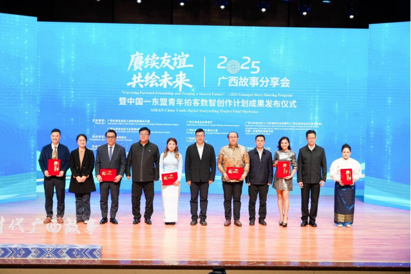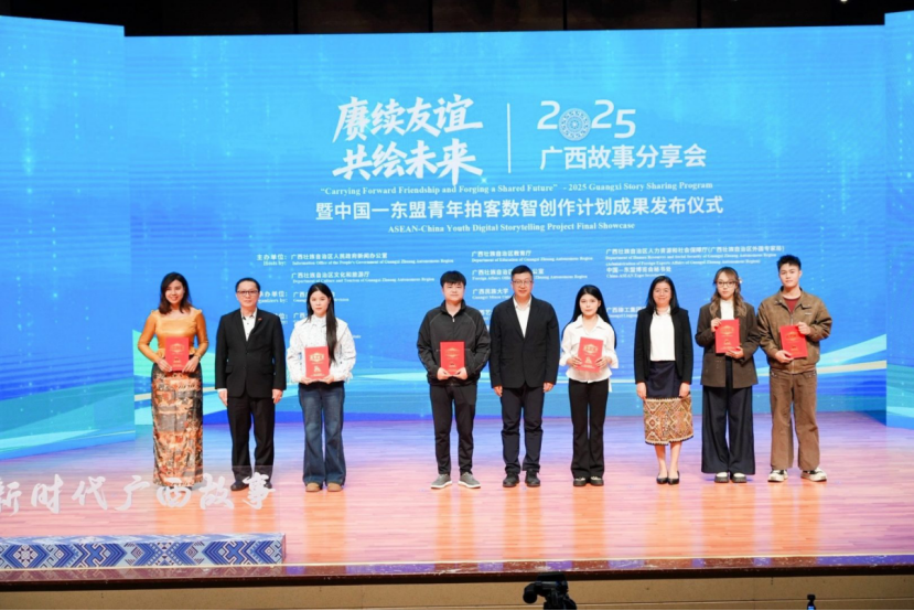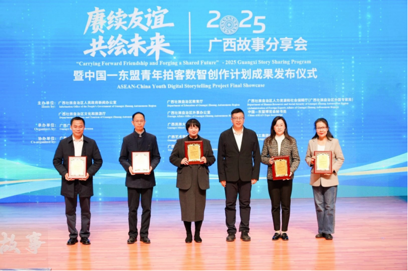 11月20日,由广西壮族自治区人民政府新闻办公室、广西壮族自治区教育厅、广西壮族自治区人力资源和社会保障厅(广西壮族自治区外国专家局)、广西壮族自治区文化和旅游厅、广西壮族自治区外事办公室、中国—东盟博览会秘书处联合主办的“赓续友谊 共绘未来”2025广西故事分享会暨中国—东盟青年拍客数智创作计划成果发布仪式,在广西民族大学思源湖校区音乐厅举行。自治区有关单位、高校负责人,柬埔寨、老挝驻南宁总领馆官员,驻邕高校师生、留学生以及相关企业机构代表共约250人参加活动。